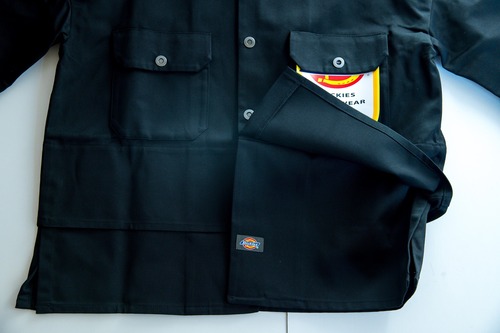 シンヤコズカ DICKESコラボジャケット ややルーズなワークジャケットで裾をレイヤードに仕立てた別注アイテム。 袖の振りも計算されたパターンで独自のシルエット。 コットンツイルで光沢感があり、ハリ感が立体的なワイドシルエットを完成させています。 S M 着丈 64 66 身幅 56 58 肩幅 64 66 袖丈 56 58